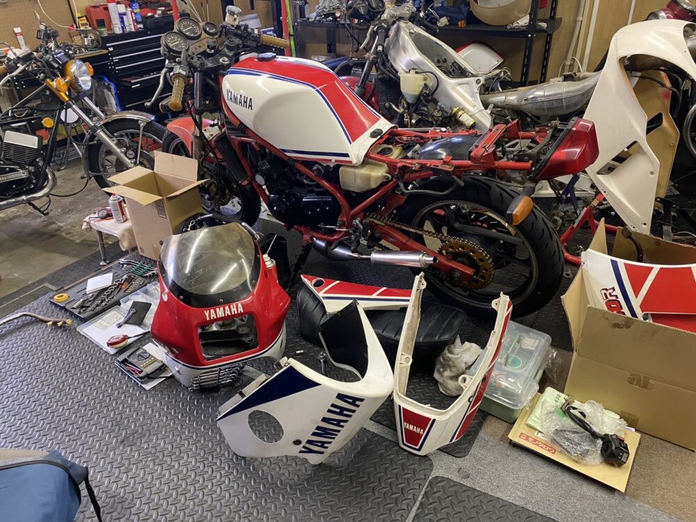 現在(2025/11/05)、YAMAHA RZ250RR(51L)を整備中です。51Lの低走行車(12000キロ)多少ヤレてますが、状態良し。アンダーカウルまであるのは珍しいです。