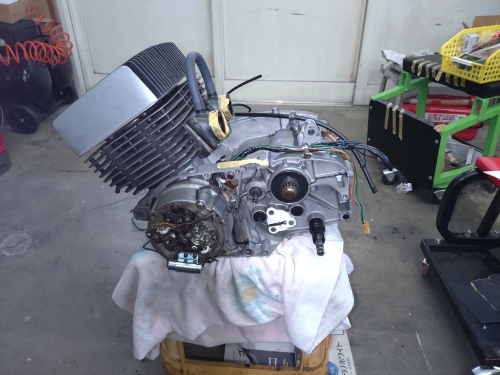 エンジンをフレームに組付け、エンジンの始動を確認。始動はかなり良い感じです。